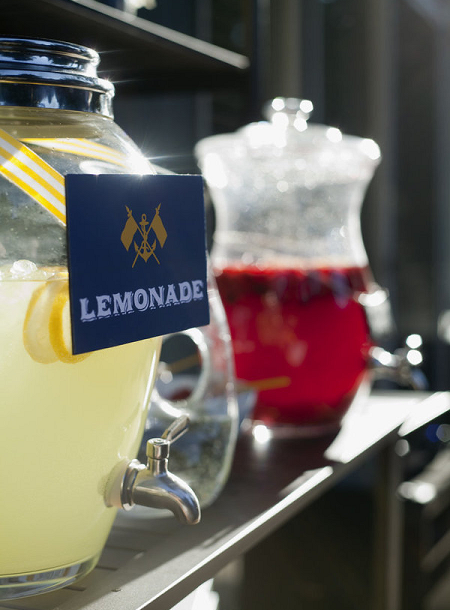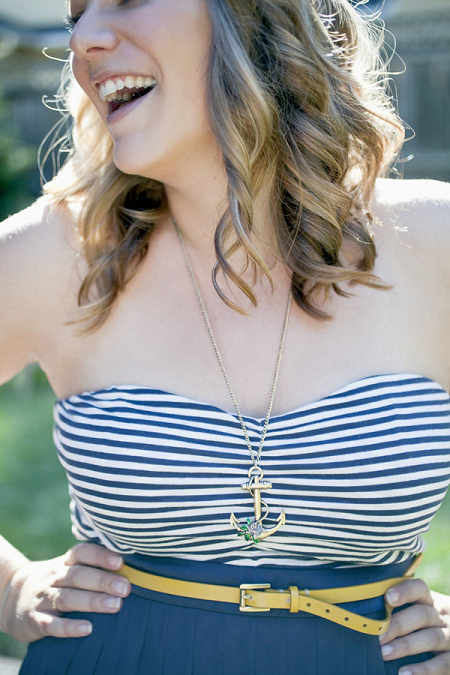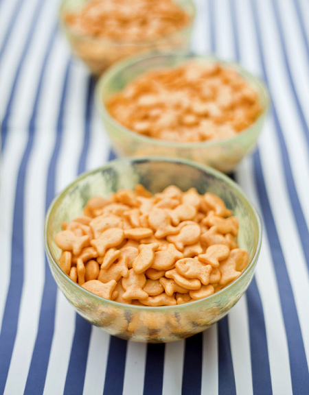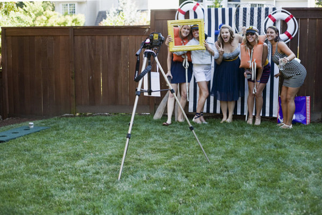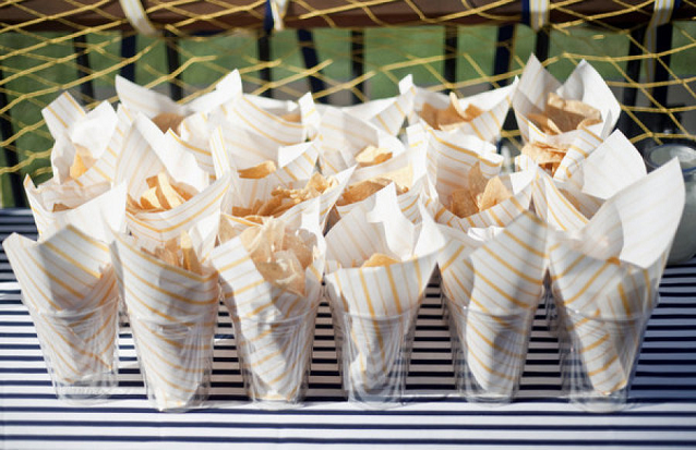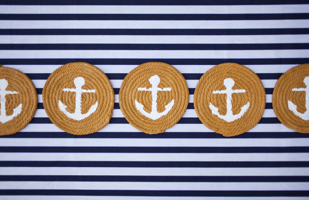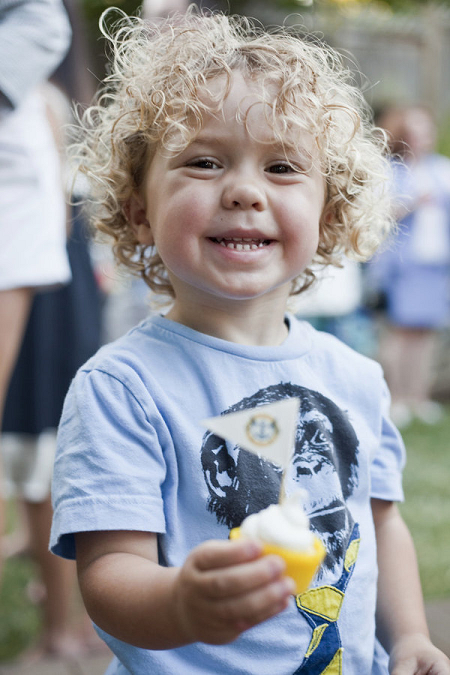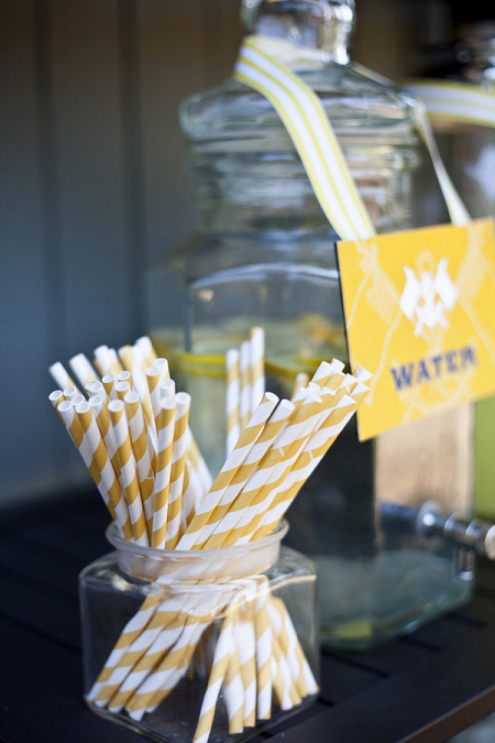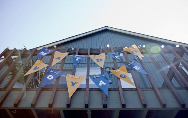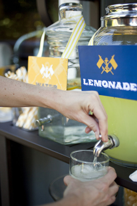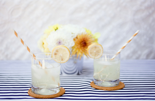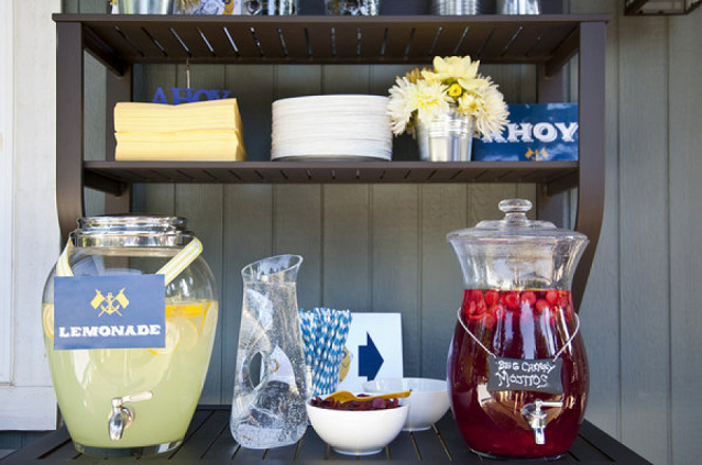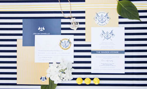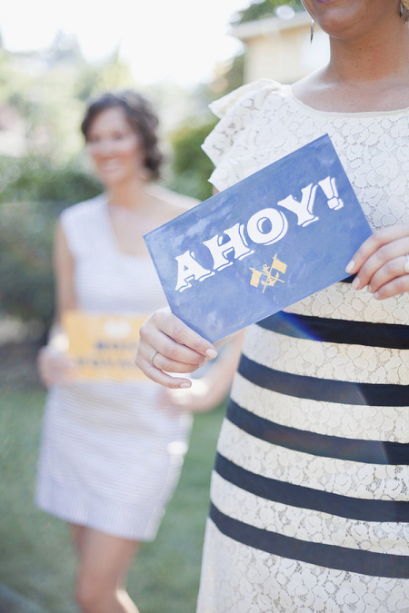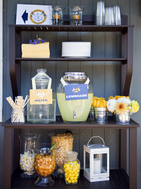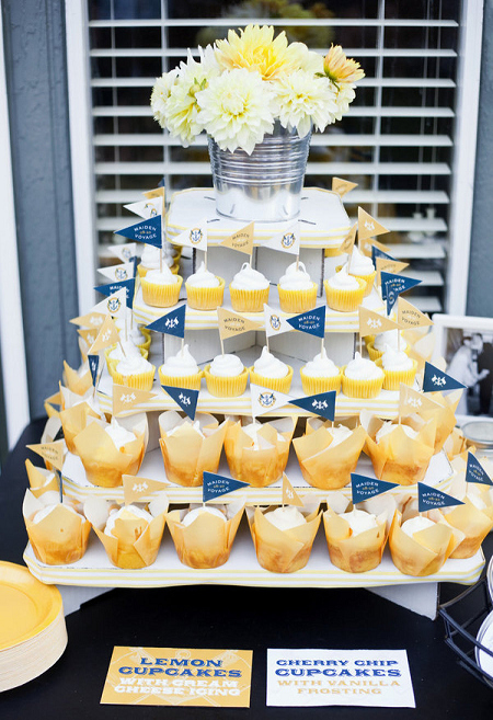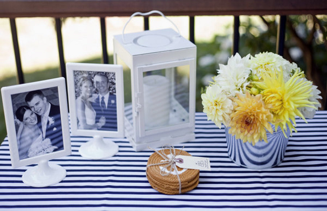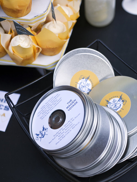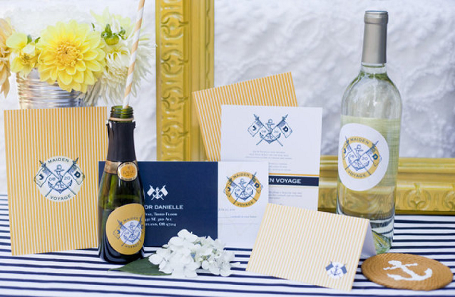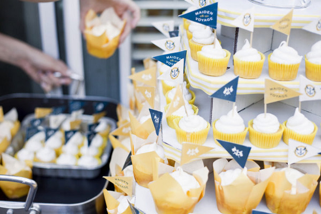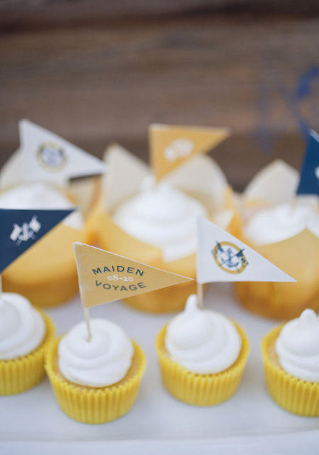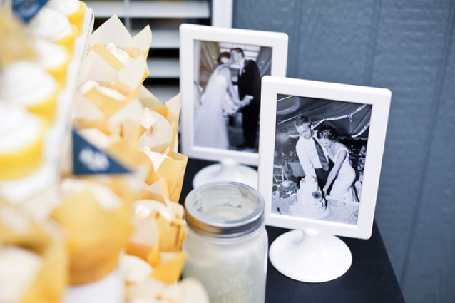The Look: Maiden Voyage with yellow/blue color motif . Customized wine labels for wine bottles and mini bottles of champagne, cupcakes, photos of the two couples from their wedding days, a photo booth with nautical themed props, enlarged copies of their new licenses for guests to sign their well-wishes on.